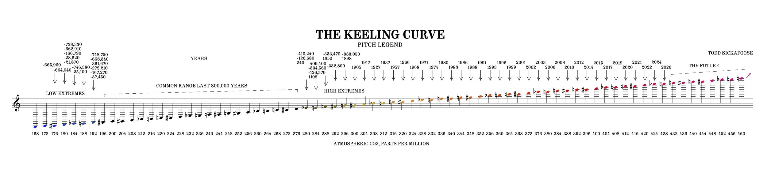 – The drone rises and falls in pitch as the Keeling Curve's CO2 measurement rises and falls. 265 ppm equates to middle C and pitch rises a half-step for each additional 3 ppm. (It can be interesting to listen for extended periods of low pitches – those correspond to ice ages. There are seven ice ages represented here, the last of which is called the Wisconsinan Ice Sheet and bottoms out 15 minutes into the final hour. It is the eeirily steady warming period that follows which lays the fertile bed for population explosions of homo sapiens over the last 15,000 years.)